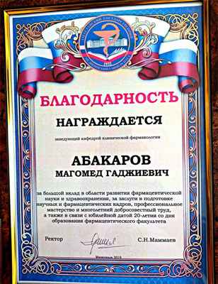 АБДУРАХМАНОВ Тинав Магомедович, кандидат медицинских наук, доцент, до 09.2014 года заведующий кафедрой, главный внештатный клинический фармаколог, главный эксперт по фармакологии, руководитель центра мониторинга безопасности лекарственных средств МЗ РД, заслуженный врач Республики Дагестан, врач высшей категории, автор более 100 научных и 12 научно – методических работ. Доцент Т.М. Абдурахмановявляется членом ассоциации клинических фармакологов России. Активный участник многочисленных конференций клинических фармакологов России с международным участием. Т.М. Абдурахманов 15 лет проработал зам. декана лечебного факультета и 11 лет деканом факультета фармацевтического и высшего сестринского образования, организатор учебно-методической деятельности этих факультетов с момента их становления.