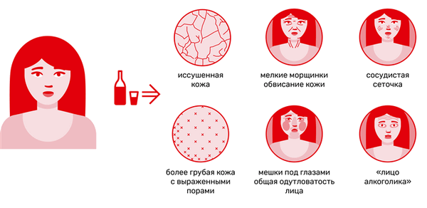 Сухость и дряблость кожи, выраженные поры и даже характерное «лицо алкоголика» - результат злоупотребления спиртным, особенно у женщин.