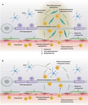 Чтобы изучить потенциальное влияние фиброзного рубцевания, вызванного воспалением, на симптоматику ЭАЭ и внутриклеточную патологию, Dorrier с соавт. провели эксперимент по потере функции, в котором были удалены пролиферирующие фибробласты с помощью трансгенно нацеленной тимидинкиназы вируса простого герпеса в сочетании с ганцикловиром. Это экспериментальное лечение привело к значительному снижению отложения коллагена в очагах ЭАЭ, но с сохранением коллагена вокруг кровеносных сосудов. Начало проявления двигательных симптомов никак не изменилось, однако на стадии хронизации заболевания наблюдалось значительное уменьшение дегенерации двигательных функций задних конечностей. На клеточном уровне не удалось обнаружить никаких эффектов инфильтрации иммунных клеток, реактивного глиоза или иммунореактивности миелина. Однако исследователи выявили значительное увеличение Olig2-положительных КПО в областях поражения, что позволяет предположить, что фиброз может способствовать ограничению доступа КПО к воспаленной и демиелинизированной нервной паренхиме (рис. 1b). В соответствии с этим представлением эксперименты на клеточных культурах показали, что коллаген не влияет на пролиферацию или дифференцировку КПО, но значительно снижает их способность мигрировать сквозь сосудистую стенку.