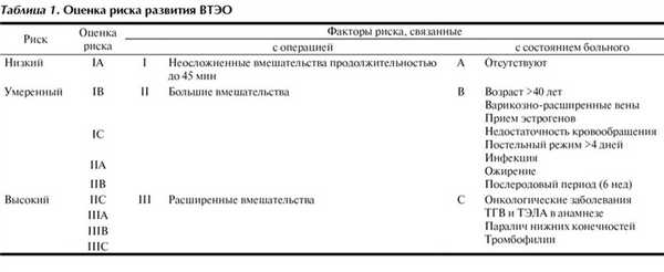 Интраоперационными факторами, связанными с послеоперационным тромбозом глубоких вен (ТГВ), служат увеличение времени анестезии, повышенная кровопотеря и необходимость в трансфузии во время операции. Важно установить эти факторы риска, чтобы обеспечить соответствующую профилактику венозного тромбоза. Основные принципы определения степени риска ВТЭ представлены в таблице ниже.
