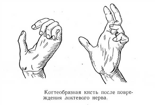 - типичное клиническое проявление патологии, существенно облегчающее диагностику, — «когтеобразная кисть». 4 и 5 пальцы постоянно находятся в полусогнутом положении;