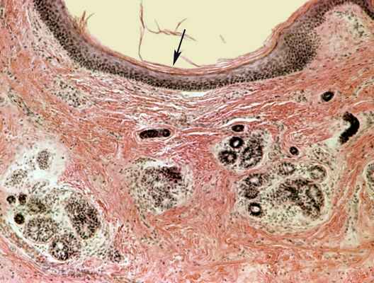 Рис. 1. Микропрепарат стенки дермоида: внутренняя поверхность кисты покрыта многослойным плоским ороговевающим эпителием (указан стрелкой), в толще стенки среди грубоволокнистых прослоек соединительной ткани расположены группы желез (придатки кожи); окраска гематоксилином и эозином; ×80.
