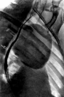 Рис. 2б). Рентгенограмма грудной клетки больной с дермоидом средостения: правая косая проекция, стрелкой указан смещенный дермоидом к позвоночнику контрастированный пищевод.