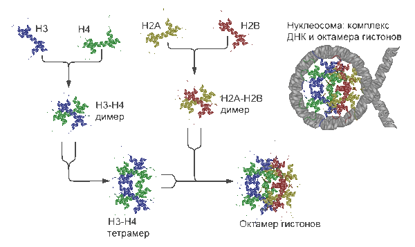 Структура и «сборка» нуклеосомы. Показано образование и строение гистонного октамера и структура комплекса ДНК-гистонный октамер — нуклеосомы.