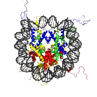 Кристаллическая структура нуклеосомы . В гистоны H2A , H2B , H3 и H4 красочны, и с ДНК в серый цвет. (PDB: 1EQZ ))