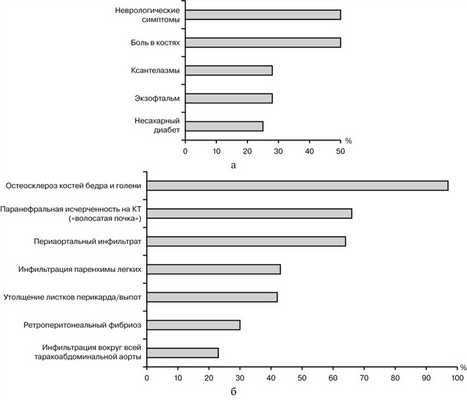Рис. 8. Наиболее частые поражения при БЭЧ (по [15]). а — жалобы, данные обследования (в нашем случае имелись только ксантелазмы и экзофтальм); б — результаты визуализирующих исследований (в нашем случае выявлены поражения всех перечисленных локализаций за исключением инфильтрации паренхимы легких).