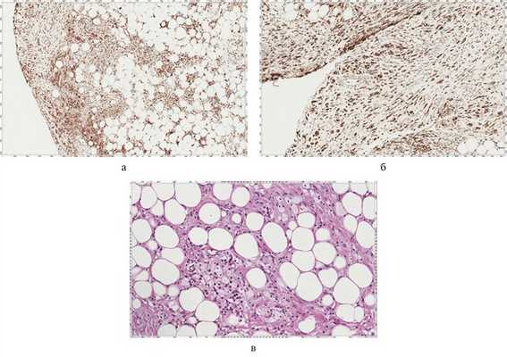 Рис. 7. CD68+. а — реакция с антителами к CD68, множество гистиоцитов, ув. 40; б — ув. 100; в — множественные плазматические клетки, гистиоциты, клетки типа ксантомных среди полиморфно-клеточного инфильтрата, окраска гематоксилином и эозином.