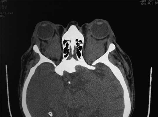 Рис. 3. Двусторонний экзофтальм. В ретробульбарной клетчатке орбит мягкотканые образования с неровными контурами полностью выполняющие полости глазниц.
