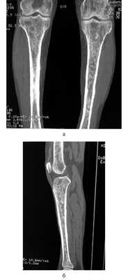 Рис. 5. Множественные остеосклеротические очаги в бедренных (а) и большеберцовых (б) костях.