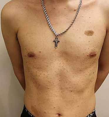 Рис. 1. Пациент А. 18 лет. Болезнь Реклингаузена. Пигментные пятна «кофе с молоком», множественные кожные нейрофибромы на коже передней брюшной стенки