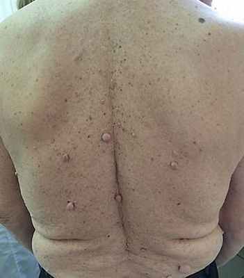 Рис. 2. Пациент В. 47 лет. Множественные кожные нейрофибромы на спине больного нейрофиброматозом I типа