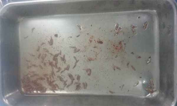 Таким образом, было проведено первичное симптоматическое лечение. Рана была очищена и дезинфицирована раствором хлоргексидина 0,12%. Личинки вручную удаляются под местной анестезией с помощью клинических пинцетов, все асептическое поле, личинки в этом случае были собраны и помещены в клинический лоток. Около 80 личинок были вывезены из региона, и все они не могли быть удалены (рисунок 2).