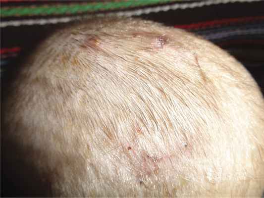Рис. 1. Ребенок 2 лет. На коже волосистой части головы участки эритемы, узелки с черными точками в центре, пустулы, гнойные корочки.