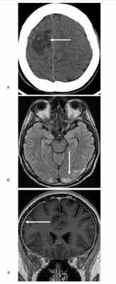 На момент диагностики криптококкоза 17 больным выполнили компьютерную томографию (КТ) органов грудной клетки и у 57% выявлены неспецифические изменения в легочной ткани. Во всех случаях при менингите/менингоэнцефалите выполнена КТ или магнитно-резонансная томография головного мозга. У 12 (71%) больных обнаружили изменения, из них гидроцефалию у 47%, очаги у 32%, утолщение оболочек головного мозга у 8% (см. рисунок). Рисунок 1. Криптококковый менингоэнцефалит у больных апластической анемией (а; КТ головного мозга: очаг пониженной плотности, неправильной формы с четкими контурами, размером 42,4×27,8×20 мм), лимфосаркомой (б; магнитно-резонансная томограмма — МРТ головного мозга: очаги неправильной округлой формы размером от 5 до 9 мм в затылочных областях обоих полушарий головного мозга) и острым лимфобластным лейкозом (в; МРТ головного мозга: равномерное утолщение твердых мозговых оболочек до 2—3 мм с интенсивным накоплением контрастного препарата).