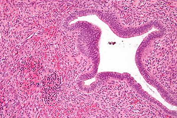 Микрофотография показывая ядросодержащие эритроциты (внизу слева изображения), один из элементов, необходимых для вызова экстрамедуллярного кроветворения, в полип эндометрия. H&E пятно.