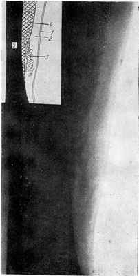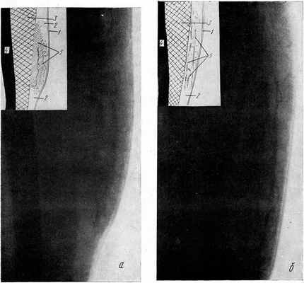 Рентгенографию производили на аппарате УРДД-110-К-4, без кассет и усиливающих экранов. Для поглощения вторичных лучей, образующихся в штативе для снимков, под рентгеновскую пленку, завернутую в плотную бумагу, перед производством снимка подкладывали просвинцованную резину. Условия съемки: 40—42 kV, 80 mA, 1,5—1,8 секунды, фокусное расстояние 70 см. При этом на рентгенограммах отчетливо видны кожа, подкожная клетчатка и подлежащий слой мышц. Для сравнения производились аналогичные снимки неповрежденной конечности.
