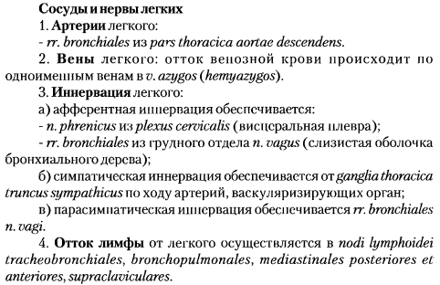 Сосуды и нервы легких. Артериальная кровь для питания легочной ткани и стенок бронхов поступает в легкие по бронхиальным ветвям из грудной части аорты. Кровь от стенок бронхов по бронхиальным венам оттекает в притоки легочных вен, а также в непарную и полунепарные вены. По левой и правой легочным артериям в легкие поступает венозная кровь, которая в результате газообмена обогащается кислородом, отдает углекислоту и становится артериальной. Артериальная кровь из легких по легочным венам оттекает в левое предсердие. Лимфатические сосуды легких впадают в бронхолегочные, нижние и верхние трахеобронхиальные лимфатические узлы.
