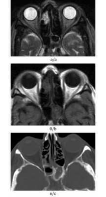 (Слева) При аксиальной МРТ Т2ВИ у пациента с двухсторонним АГС определяется диффузный гипоинтенсивный сигнал в пораженных ячейках решетчатой кости. Определяется легкое вздутие пазухи с латеральным смещением глазничной пластинки. Обратите внимание на очень низкую интенсивность сигнала, что создает впечатление о нормальной воздушности пазухи.