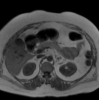 (Справа) МРТ, Т1-ВИ, аксиальная проекция: крупное образование, смещающее большую часть правой почки. Образование имеет гомогенный сигнал низкой интенсивности, смещает почечные сосуды, но не прорастает их.