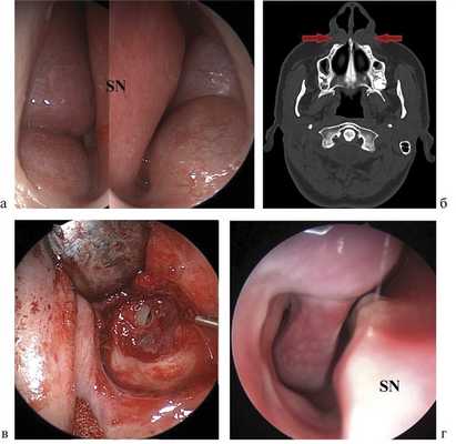 Рис. 2. Больная В. а — передняя риноскопия. Выстояние носогубных кист в просвет полости носа с двух сторон (SN — septum nasi); б — КТ, аксиальная проекция. Стрелками указаны носогубные кисты с двух сторон; в — эндофотография этапа операции. Дефект слизистой оболочки дна полости носа; г — эндофотография. Состояние на 14-е сутки после операции.