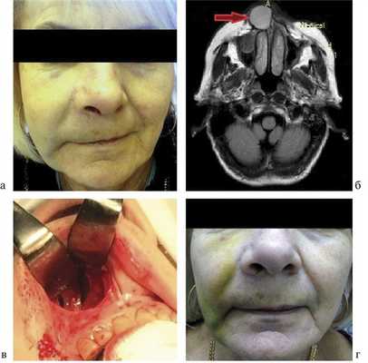 Рис. 1. Больная А. а — деформация лица за счет припухлости в области носогубной складки, смещение крыла носа справа; б — МРТ, Т2-режим. Стрелкой указана носогубная киста; в — этап операции. Дефект слизистой оболочки дна полости носа; г — больная А. на 14-е сутки после операции.