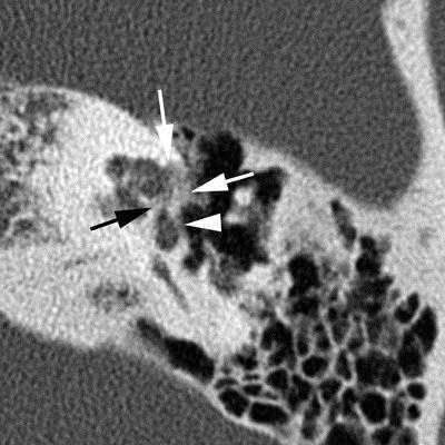Типичные признаки начальной, фенестральной формы отосклероза на КТ – это участок понижения плотности, как правило округлой или неправильной формы, расположенный в костной капсуле лабиринта у переднего края окна преддверия. При развитии болезни этот очаг увеличивается и вовлекает передние отделы основания стремени. При улитковой форме аналогичные очаги располагаются вокруг улитки.