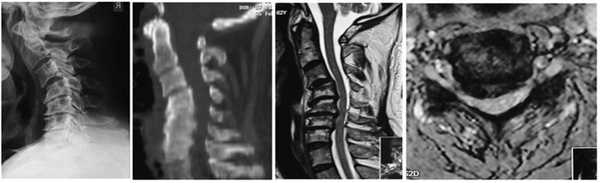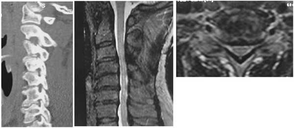 На рентгенограммах и снимках мультиспиральной компьютерной томографии (МСКТ) шейного отдела позвоночника выявлены кифотическая деформация, нестабильность позвоночника, при проведении МРТ отмечены признаки передней компрессии, деформации спинного мозга (рис. 2). Рис. 2. Рентгенограмма и снимок МСКТ позвоночника (сагиттальная проекция), МРТ позвоночника (сагиттальная и аксиальная проекции) — тип В деформации позвоночника.