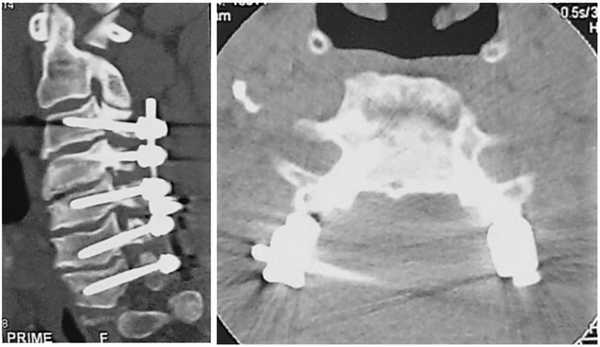 Выполнена операция: транспедикулярная фиксация СIII—СIV—СV—СVI—СVII, ламинэктомия СIV, СV, СVI, резекция дужек СIII—СVII, фораминэктомия СIII—СIV—СV—СVI с обеих сторон, декомпрессия спинного мозга и корешков на уровне СV—СVI (рис. 7). Рис. 7. МСКТ-контроль (сагиттальная и аксиальная проекции).