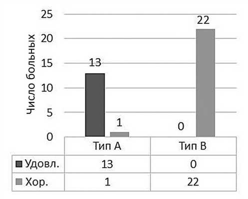 У всех больных, которым, помимо декомпрессии спинного мозга, выполнялась коррекция деформации позвоночника (тип В), был достигнут хороший результат согласно шкале JOA, в то время как у больных с выпрямлением шейного лордоза (тип А), где не проводилась коррекция деформации, хороший результат был достигнут лишь у 1 больного, в остальных случаях результат лечения, согласно шкале JOA, был оценен как удовлетворительный (рис. 1). Рис. 1. Результаты хирургического лечения, оцениваемые по шкале JOA.