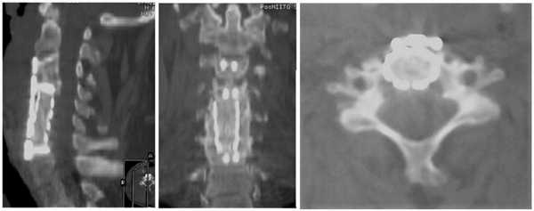 Выполнена операция: дискэктомия СIII—СIV, СIV—СV, СV—СVI, СVI—СVII, корпорэктомия СV, СVI, удаление оссифицированной задней продольной связки, оссифицированных грыж дисков, декомпрессия спинного мозга и корешков на уровне СIV—СVI, коррекция деформации позвоночника, корпородез СIII—СIV кейджем, СIV—СVI — меш-кейджем с фиксацией пластиной (рис. 3). Рис. 3. МСКТ-контроль (сагиттальная, коронарная, аксиальная проекции).