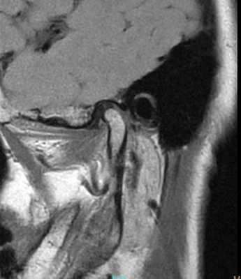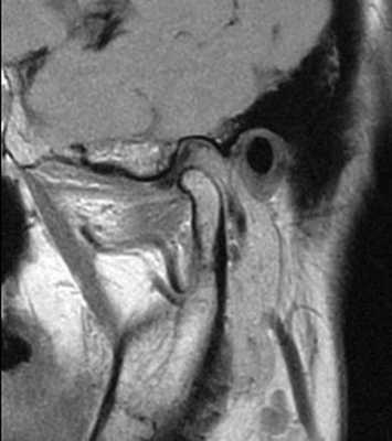 Фото 3. МРТ-скан левого ВНЧС при закрытом состоянии рта: визуализация переднего смещения диска без редукции.
