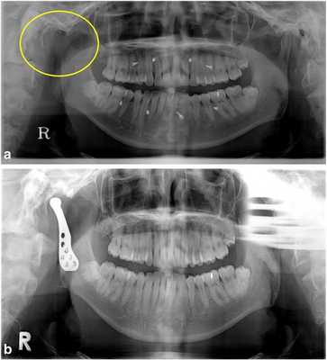 а) Правый мыщелок был удален (желтый круг) из-за карциномы наружного слухового канала. Для поддержания окклюзии в течение 8 месяцев использовались межчелюстные фиксационные винты и эластичные ленты.