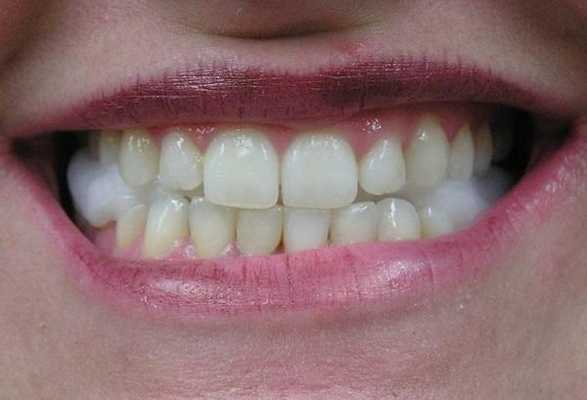 b) Передний открытый прикус, который раздвинулся во время лечения с использованием шины.