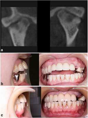 Чтобы предотвратить прогрессирование патологии, была запланирована реконструкция ВНЧС. Во время операции было выполнено заднее перемещение верхней челюсти посредством остеотомии по Le Fort I, поскольку верхние передние зубы пациентки находились в состоянии протрузии. После резекции обоих мыщелков реконструкция ВНЧС с использованием протеза проводилась посредством вращения нижней челюсти против часовой стрелки для закрытия переднего открытого укуса (фото 3с). С момента операции на данный момент прошло уже 2 года, и в данный период не было отмечено никаких признаков воспалительного поражения области вмешательства. Симптомов прогрессирования открытого прикуса также не наблюдалось.