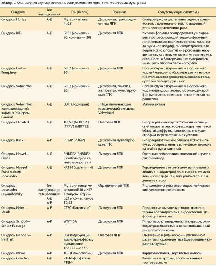 Кератодермия может являться одним из основных симптомов ряда синдромов [12—17] (табл. 2).