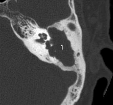На практике у детей часто встречается вторичная холестеатома, которая развивается на фоне хронического гнойного среднего отита. Наибольшие трудности в плане дифференциальной диагностики злокачественной опухоли представляет агрессивная холестеатома у детей раннего возраста (2—5 лет). Главными отличительными ее КТ-признаками являются разрушение слуховых косточек, предсказуемый и смешанный характер деструкции, характеризующийся наличием в височной кости как участков лизиса, так и участков разрушения кости с четкими склерозированными краями [8] (рис. 5). Рисунок 5. Холестеатома аттико-антральной области. Аксиальная проекция левой височной кости. В аттико-антральной области определяется деструктивная полость (1), выполненная мягкотканным субстратом. Костные стенки полости неровные, но четкие склерозированные, слуховые косточки разрушены и не определяются.