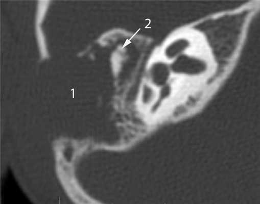 Невринома лицевого нерва в отличие от злокачественной опухоли характеризуется на КТ наличием в височной кости мягкотканного образования, имеющего достаточно ровные четкие контуры. Образование располагается по ходу одной из частей канала лицевого нерва и вызывает разрушение его костных стенок [5, 6, 9]. Невринома мастоидальной части лицевого нерва вследствие близкого расположения к наружному слуховому проходу часто распространяется в его просвет в виде округлого образования, вызывающего разрушение задней стенки (рис. 6). Рисунок 6. Невринома лицевого нерва. Аксиальная проекция левой височной кости. По ходу мастоидальной части канала лицевого нерва определяется объемное образование (1), распространяющееся в наружный слуховой проход (2). Стенки мастоидальной части канала лицевого нерва и задняя стенка наружного слухового прохода разрушены (стрелка). При клиническом осмотре в наружном слуховом проходе определяется образование плотноэластической консистенции на широком основании.