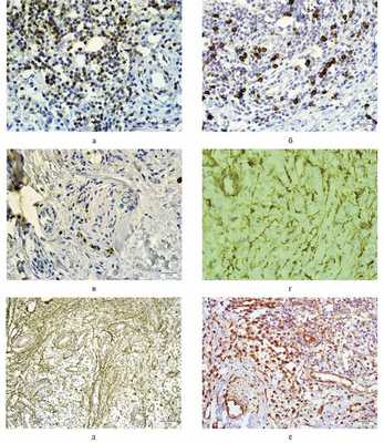 Рис. 2. Иммуногистохимическая картина ГПА орбиты. а — CD4+-лимфоциты в воспалительной ткани; б — CD8+-лимфоциты в воспалительной ткани; в — CD56 (NK-клетки) в воспалительной ткани; г — Vim (мезодермальная ткань); д — Col III в гранулематозной ткани; е — VEGF. Иммуногистохимическая реакция. а—г, е — ×200; д — ×100.