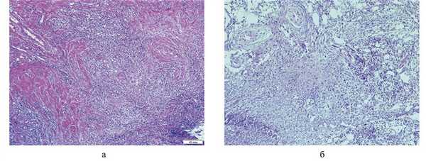 Рис. 1. Микроскопическая картина ГПА орбиты. а — до лечения: выраженная воспалительная реакция, пролиферативно-деструктивный васкулит; б — после иммуносупрессивного лечения спустя 1,5 года: воспалительная инфильтрация сохраняется, наблюдаются обширные очаги фиброза. Окраска гематоксилином и эозином. ×100.