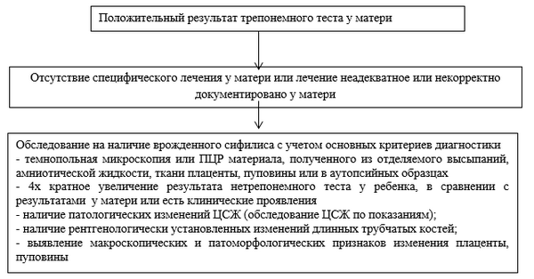Решающую роль в диагностике врожденного сифилиса имеют серологические реакции. Неспецифические исследования (реакция Вассермана, RPR-тест) могут давать ложноположительные результаты. Поэтому при подозрении на врожденный сифилис широко применяются также специфические серологические исследования: РИФ, РИБТ, РПГА. ПЦР-выявление бледной трепонемы проводят с кровью, соскобом, отделяемым кожных элементов пациентов с врожденным сифилисом. Точность результата — 97%.