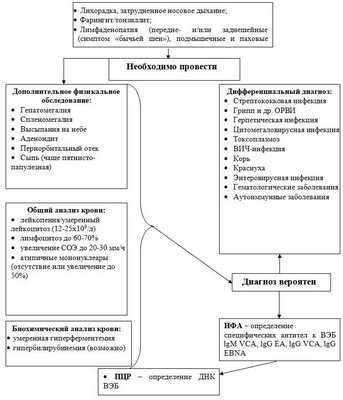 | Анамнез: • острое/постепенное начало заболевания; • появление развернутой клинической картины заболевания к концу 1-й недели заболевания; • сохранение лихорадки и интоксикации в течение 1– 4 недель; • сочетание ангины с системным увеличением лимфатических узлов, увеличением печени и селезенки; • возможное появление сыпи на 3–5-й день; • редкость полиорганных поражений. Эпидемиологические факторы: • наличие контакта с подобным заболеванием, или с подтвержденным диагнозом «инфекционный мононуклеоз». |