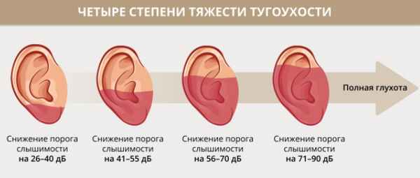 В зависимости от тяжести поражения различают 4 степени тугоухости: