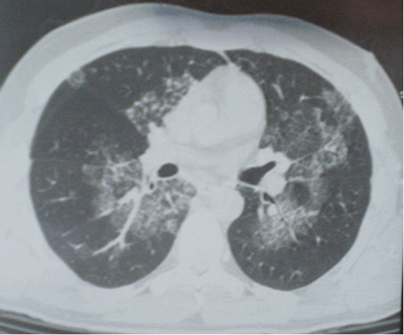 При КТВР выявляются затемнения по типу «матового стекла», утолщение интралобулярных структур и междольковые перегородки типичной полигональной формы. Эти признаки не являются специфичными и могут выявляться при остром респираторном дистресс-синдроме, вирусной пневмонии, липоидной пневмонии, бронхоальвеолярном раке и пневмонии, вызванной Pneumocystis jirovecii.