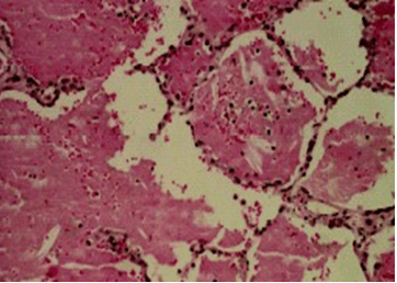 Рисунок 3. Гиперплазия стенки бронхиол и скопление аморфного эозинофильного материала в просвете альвеол, мелкоточечные геморрагии (гематоксилин-эозин, х200)