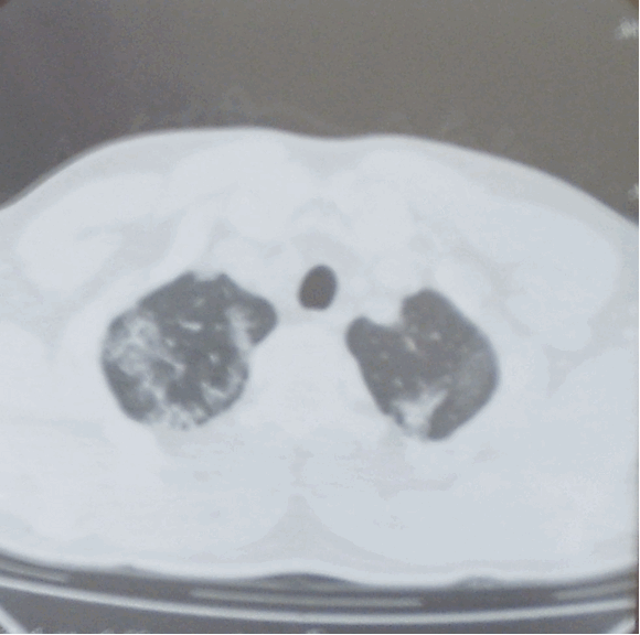 - нетипичная для АП локализация поражения: по данным КТ ОГК отмечается поражение не только задне-базальных, но и верхних отделов легких (рис 2). Помимо этого, визуализируется поражение плевры в виде множественных плевральных сращений, что не характерно для АП.