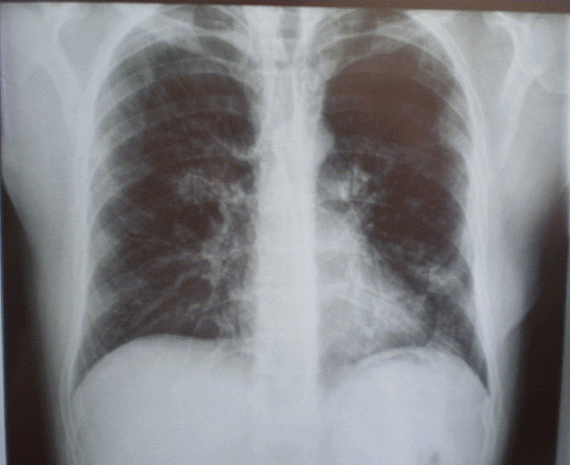 Клинический случай. Больной П., 32 лет, поступил в пульмонологическое отделение НУЗ «ЦКБ №1 ОАО «РЖД» в связи с выявлением при диспансерном обследовании изменений на флюорограмме в виде усиления и деформации легочного рисунка в прикорневых областях обоих легких. Амбулаторно была проведена рентгенография органов грудной клетки, на которой вышеуказанные изменения были подтверждены (рис. 1). Для дообследования и верификации диагноза направлен в стационар.