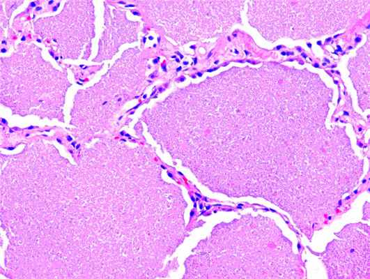 Альвеолы заполнены бесклеточным липопротеиновым ШИК-положительным сурфактантом. Клетки альвеол и интерстиция – без патологии. Поражаются преимущественно заднебазальные сегменты легкого. Плевра и средостение не вовлекаются.