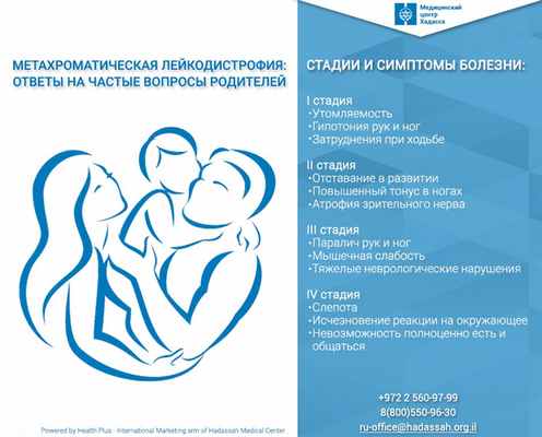 Важно понимать, что без медицинской помощи, прогнозы для большинства малышей с метахроматической лейкодистрофией не утешительны. Генетические дефекты приводят к тяжелой инвалидности и смерти ребенка в первые годы жизни. Предотвратить тяжелые последствия возможно, если своевременно начать лечение и выполнять все рекомендации врача. Медицинский центр “Хадасса” — одна из немногих клиник мира, обладающих внушительной научной и технологической базой, которая позволяет помогать маленьким пациентам с редкими болезнями.
