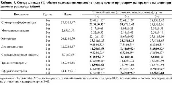 Восстановление функционального состояния печени и кишечника на фоне применения ремаксола тесно коррелировало со снижением выраженности дислипидных явлений в биомембранах клеточных структур печени и кишечника. На фоне применения апробируемого препарата была зафиксирована положительная динамика состава липидов тканевых структур печени уже в 1-е сутки терапии (табл. 1).