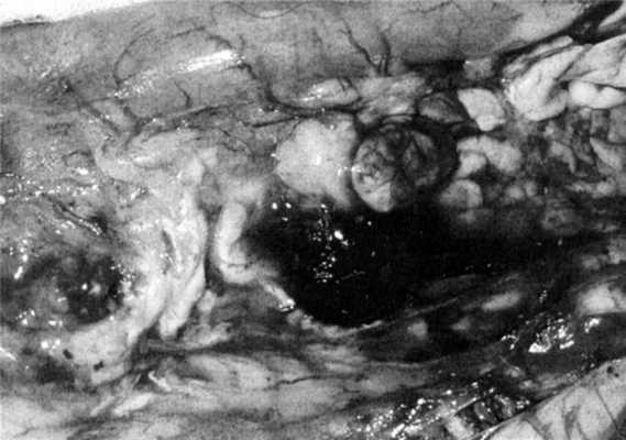 Экспериментально установлено, что при выбранной модели у всех животных возникал острый панкреатит с соответствующими макро- и микроскопическими проявлениями (рис. 1), Рисунок 1. Макроскопическая картина поджелудочной железы с прилежащими к ней тканями на 3-и сутки развития острого панкреатита. причем в 4 случаях происходило прогрессирование панкреатита, развивался тотальный панкреонекроз. Одним из клинико-лабораторных признаков острого панкреатита явилось повышение (на 145-297,9%) уровня α-амилазной активности и синдром эндогенной интоксикации, прогрессирующий несмотря на применение инфузионной терапии, что проявлялось существенным повышением в плазме крови уровня гидрофильных и гидрофобных токсичных продуктов (индекс токсичности плазмы крови превышал норму на 60,0-290,2%; р<0,05).